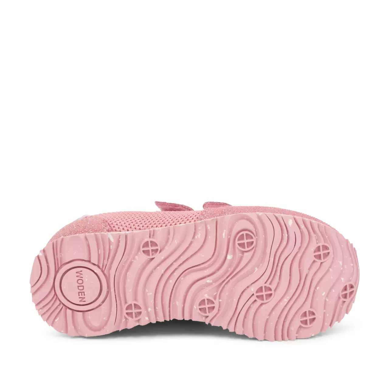 Elegant børnesneaker med glitter og detaljer i fiskeskind. Udført i åndbart kalveskindslæder, med justerbare velcrostropper og fast hælkappe som sikrer optimal komfort og støtte. Alle børnesneakers fra WODEN KIDS har FIFTY: En indersideforstærkning som består af min. 50% genbrugspolyster fra plastiskflasker. Udtagelig indlægssål i naturligt stødabsorberende kork med aftegning af voksetillæg samt ydersål i naturgummi blandet med min. 10% genbrugsgummi samt alm. gummi.